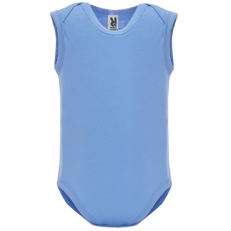 Body de bebé de tirantes de punto liso. Cuello redondo, sisas y bajo ribeteado en canalé 1×1. Cierre con botones a presión en la entrepierna. Hombro de apertura cruzada.